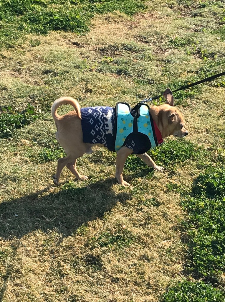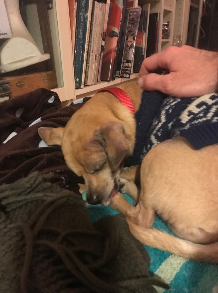 I am not sure about this week. There have been some positive developments, like meeting Maureen and getting out of the Baldwin Park Animal Shelter, but there have also been baths. Many baths. Chico is very clean, y’all, so you folks can stop washing him. I have arrived at a new house with new people, and they seem pretty nice. I really like THE MAN. He sits with me and does computer things or works on his “Little men”…something , something Star Wars, and I look like a baby Yoda or Dobby, whatever that means. The LADY made me wear weird clothes that belonged to some Joey creature. She is also big on baths. And walks. These people really like to walk, and they don’t want me to stop every five seconds and smell/pee, and they walk a really LONG time. Finally, the LADY carried me. I hear I am getting a stroller tomorrow, but I don’t know what that is. The worst part about this place isn’t the BATH LADY or the MAN who I like a lot—it is the MONSTER. They have this big, black, scary MONSTER who wants to sniff Chico and who waps Chico with his tail. He is terrifying! He gets all CRAZY trying to shove his gigantic head at me (bigger than me!), and when I snap and yip, he just doesn’t leave me alone. That said, I have the LADY now, and I am snoring on her lap. I mean, actually, I am writing this and snoring. I can multitask.
