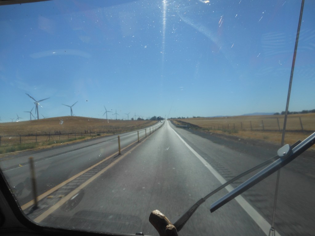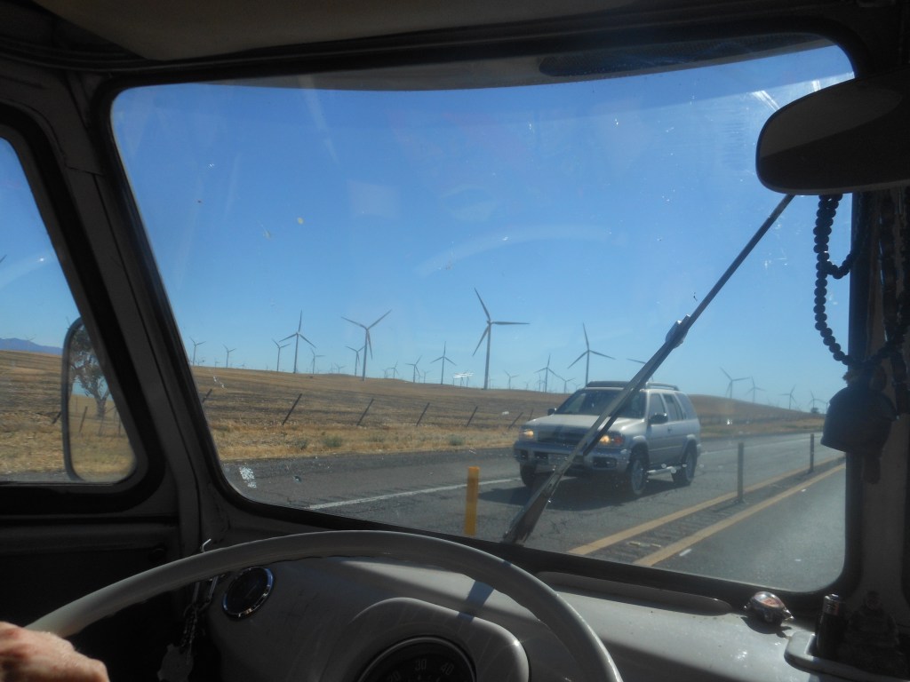 The weather turned muggy as we approached the delta, and this time we actually found the town of Lodi, but we were road weary, and the Bus had started making an ominous noise. Every time Robert braked, the front passenger’s wheel let out a series of tortured shrieks that caused considerable alarm. “Oh, well,” we thought. We will stay in Rio Vista—we stayed there on the way up to get the Bus, and it had a nice symmetry to stay there as we drove the Bus home. Driving across the wide delta fields on a narrow, two lane highway with many signs about “Drive Right/Stay Alive” and “Turn Headlines on for Safety,” and “2500 fine for any unsafe driving” we started to notice the wind was rising again. Robert had some trouble with gusts coming from side to side back on the 99, but the wind on this road was persistent, scary, and the impatience of the other drivers stuck behind the Bus was palpable. Twice we were passed in a terrifying manner, and had a cop been around, Solano county could have made 5000 $. But we made it through, and saw the mighty Sacramento, and went to the old River’s Edge lodge…only to find they had no rooms. The same depressed seeming guy from last time told Robert, “Try Lodi or Fairfield.” Backtracking to Lodi seemed like a bad idea given the road we had just survived, and Fairfield was equidistant, so we made the call, which brings me to the first official lesson of the trip: Don’t Drive Towards a Wind Farm in a 1966 VW Bus.