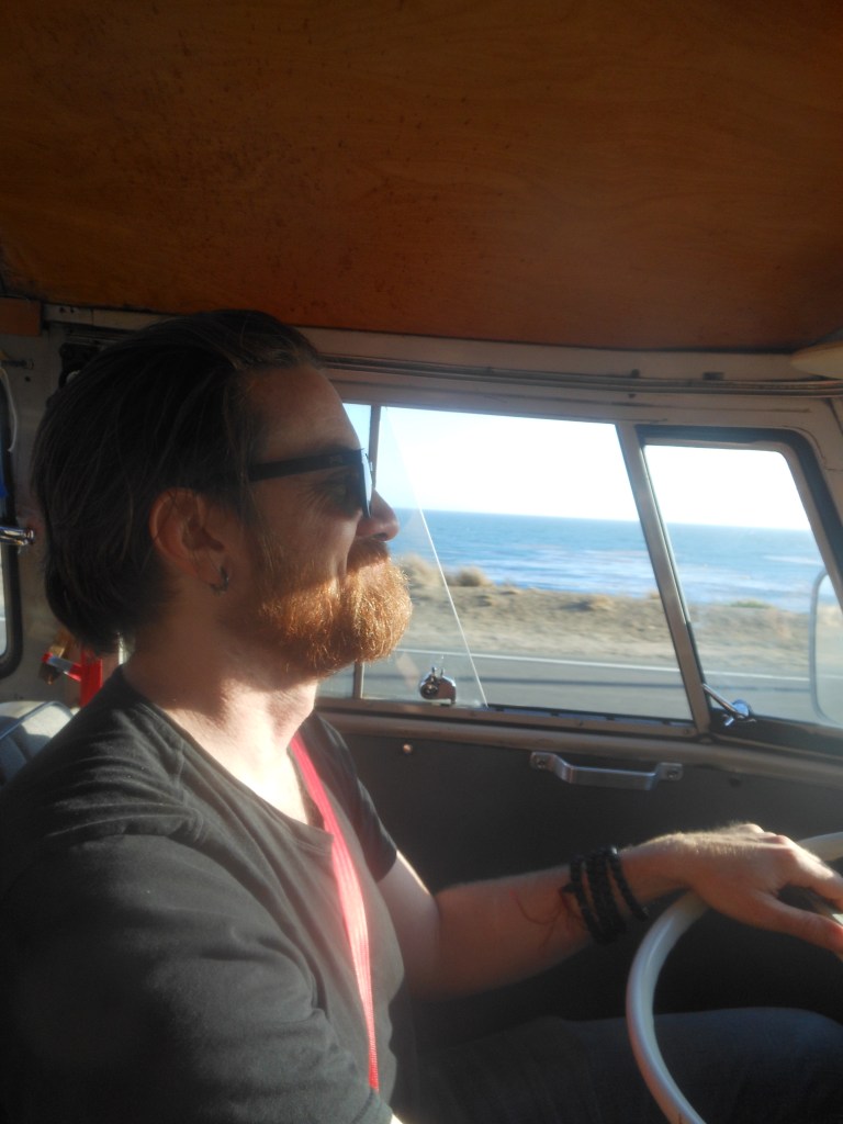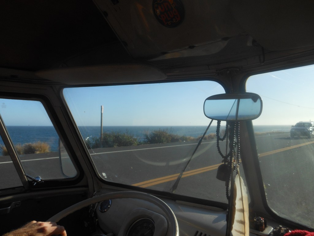We hoped to leave by 2, then 3, then sometime after 4 we got on the road, just in time for…rush hour. We saw a Bay Window blue bus on the bridge to my Mom’s to drop off food, which seemed like a good omen. Crawling through the city on the 10 freeway, I was in worry mode, tied in knots thinking about all that I had not done, worrying about all the hills ahead to climb, but Robert was already in Road Mode, joyously driving the Bus, keeping up a steady stream of jokes, exhortations to the Bus, and starting our official trip VW count. (blue bus=1, first day total=6).