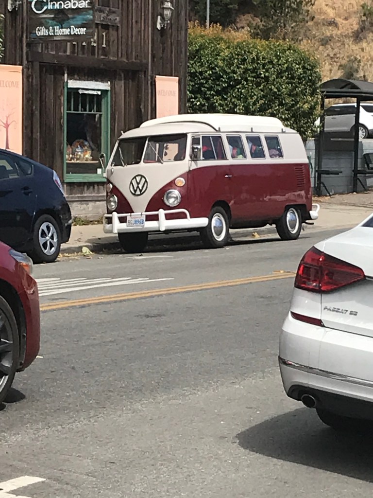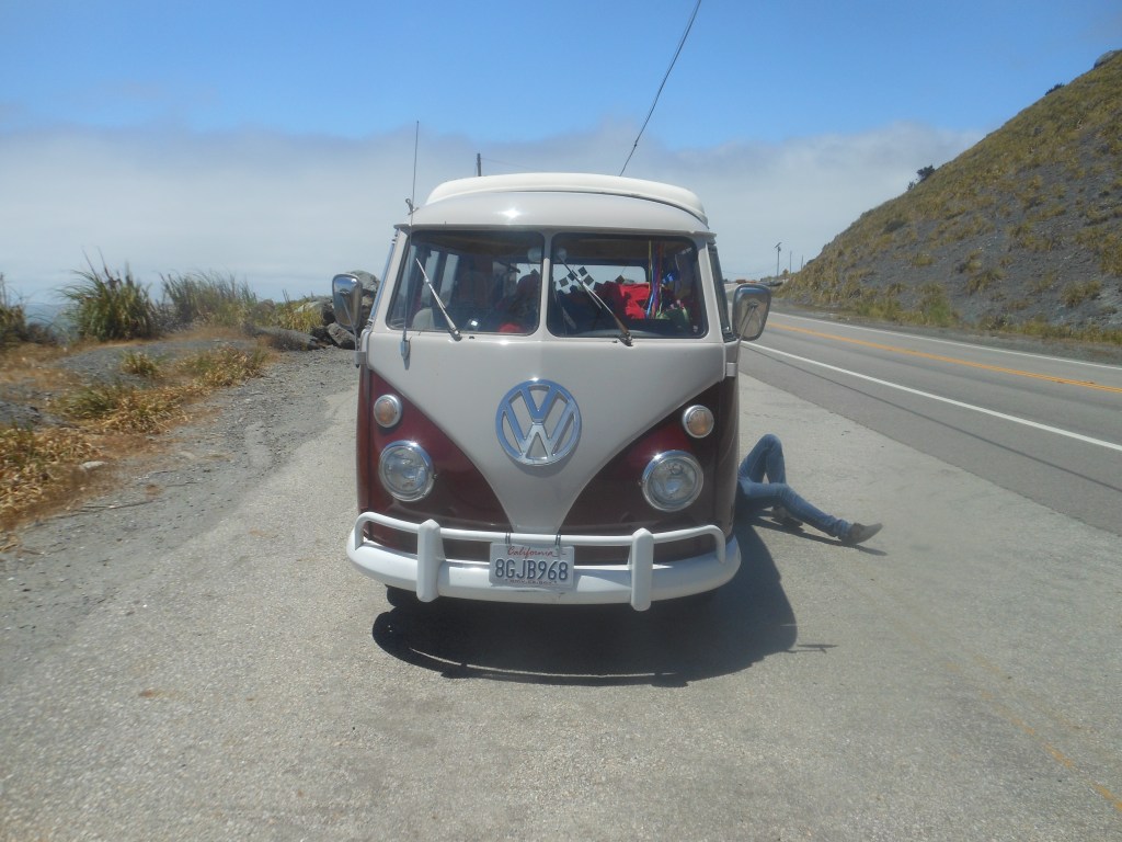 Have you driven Highway One from Pacific Grove to San Simeon? If so, congratulations! You survived. If not, well, it is a twisty road, and it is a high road—think airplane high, above the clouds at times, and think sheer drops to rocks and the sea impossibly far below. And guardrails? Well, apparently they installed some in 2012, but there are stretches with nothing between you, your 1966 VW Bus, and certain death. Now add falling rocks! And large RVs rounding corners as oncoming traffic! And middle aged men driving fast cars with something to prove. Oh, and don’t forget wind! The Bus is a box kite. There are these “road curves” signs, a graphic of a winding road every few miles to remind you that this is a winding road in case you missed that, making me think the road sign crew for Highway One has a twisted sense of humor (pun intended). We avoided this part of the 1 on our trip to get the Bus, but we had traversed part of it on a camping trip to San Simeon, so we were confident. Well, Robert was confident, but I was a little nervous, and even though I have driven the 1 on worse stretches (Sonoma Coast outside Jenner being one), for some reason I had a cumulative attack of the vapors this time. So there we were, clinging to the side of a cliff above the sea, me freaking out (quietly, of course), and trying to joke about the falling rocks (at least there were no cows—the part in Sonoma has cows).