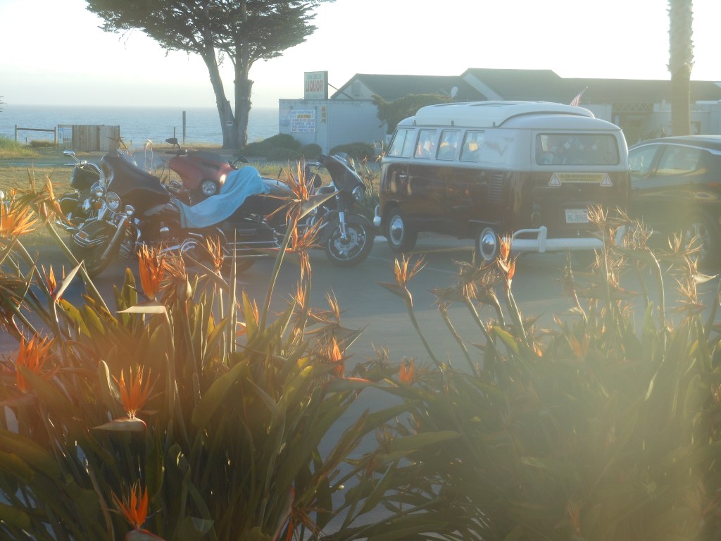 Should we head for home? The sun was setting…and we were frazzled. Should we try to see if a campsite was available? We decided to try, and the Bus whistled all the way back to San Simeon State Park, but there were no campsites. Thankfully the San Simeon Lodge had a room next to some nice bikers and a Steve Bannon lookalike, but we were so happy to be there. I wrote last night’s blog and read aloud from the Tsunami book (it is amazing! You should read it!) and Robert read How To Keep Your Volkswagen Alive: A Manual of Step-by-Step Procedures by John Muir, the 74’ edition, or as every person who ever talks to us about the Bus refers to it, “the book,” as in “Do you have the book?” No, not the Bible, but John Muir. Robert is re-reading it, and apparently this time it makes more sense.