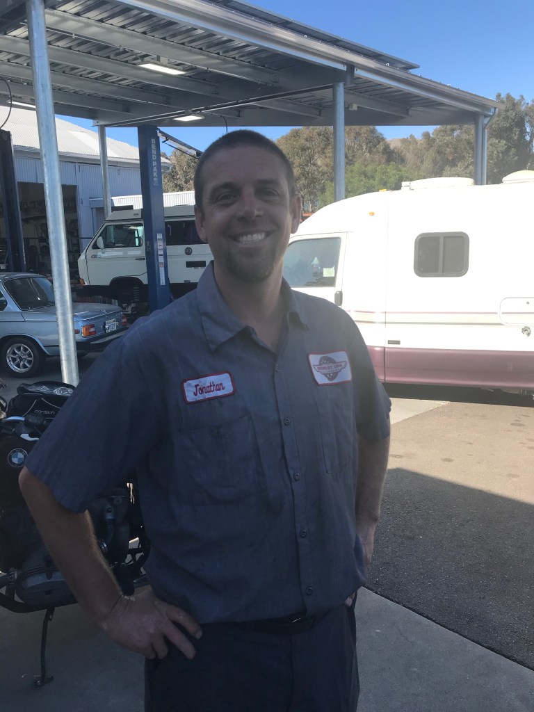 Let the panic begin! We drove on down the mountain and into the flats, panicking with no cell service. In San Simeon Robert saw another red Bus, hopped out to see if that person might be able to help, and discovered it was the lady we know from South Pasadena, who could not help. Then we called Eric the mechanic, and he told us to get it to a shop. So we started calling shops: nothing in Cambria or Morro Bay, and some folks in San Luis Obispo told us to call Broad Street but we probably wouldn’t get in.