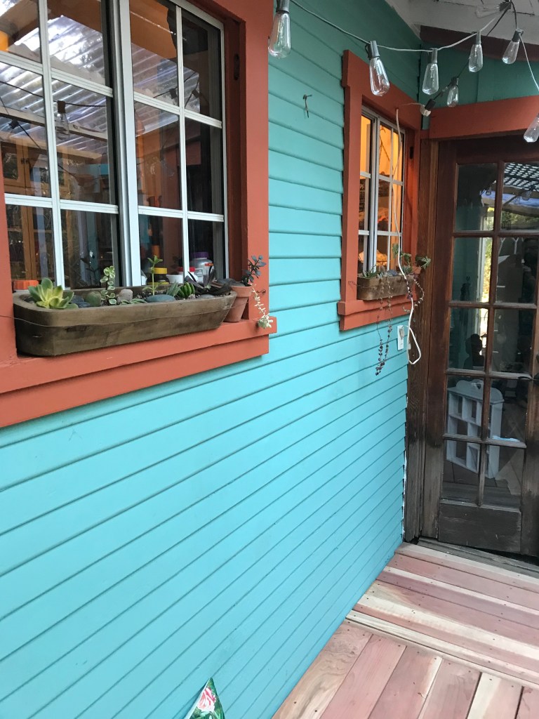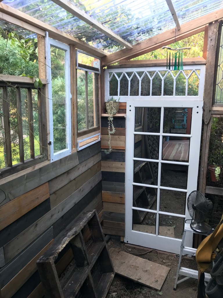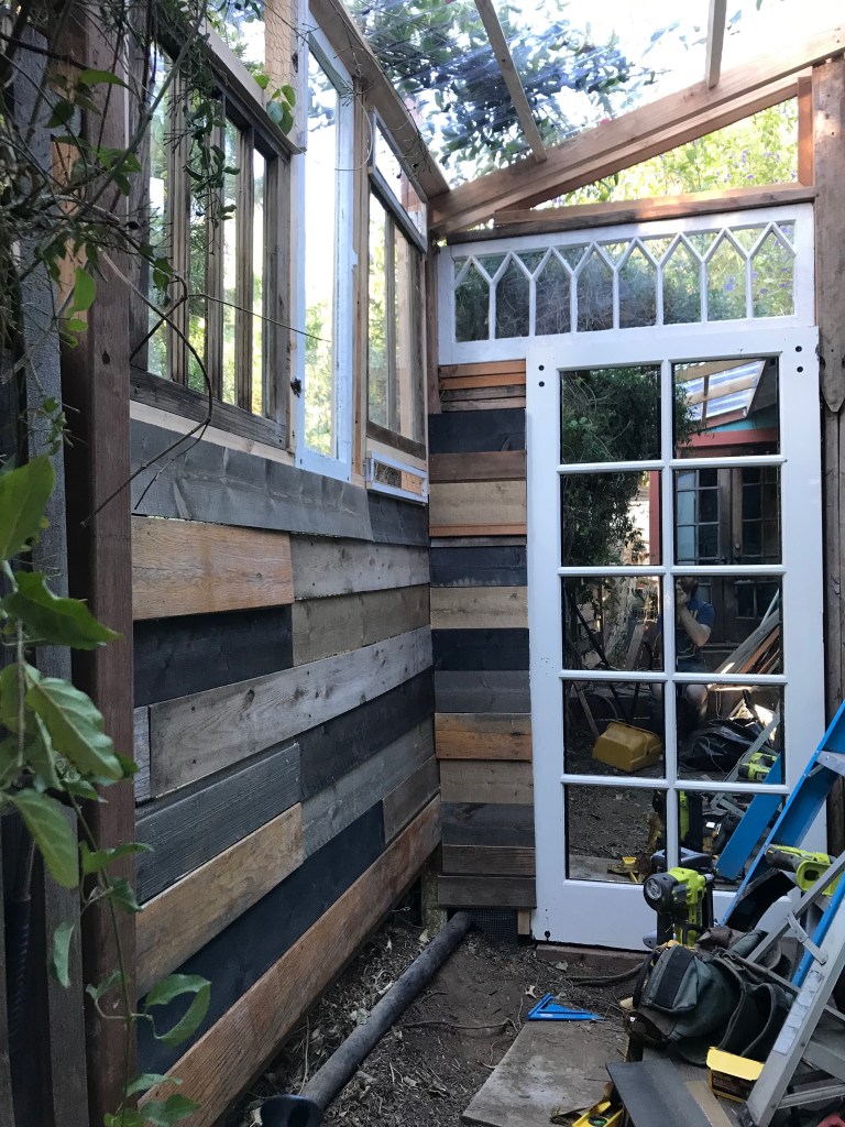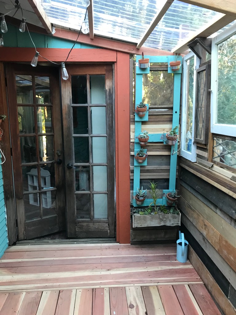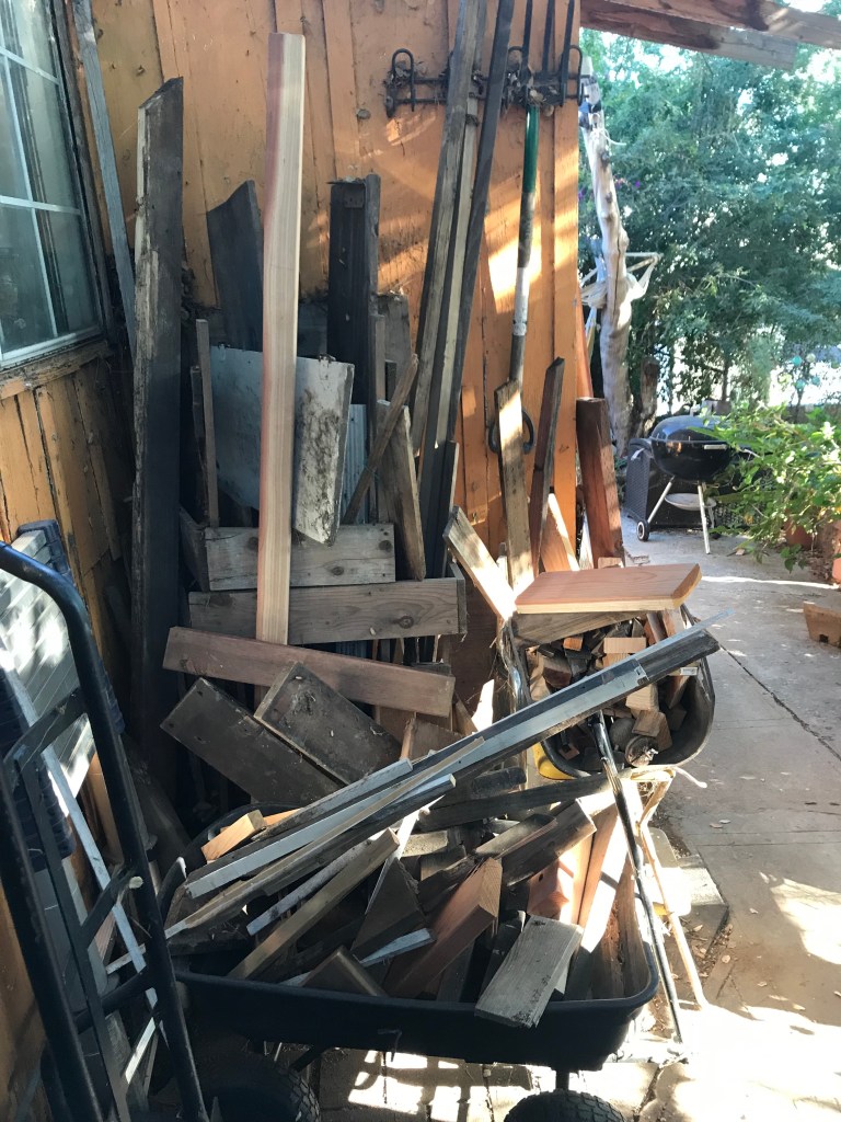 Lesson #2: Reduce, Reuse, Recycle. We used up a ton of scrap wood from a job at my Mom’s house (old floors), old wood we had, and the scraps from the demo and this project, which made this a collage of all the wood from times ago. You can see this in the woodpile (and yes, once we finish the pond I will get the wood away from the house because of termites!) Robert built me a sweet planter for the plant wall (made from a pallet that furniture came on) and watching the water drip from plant to plant and into the custom-made tree trunk box was a real highlight.