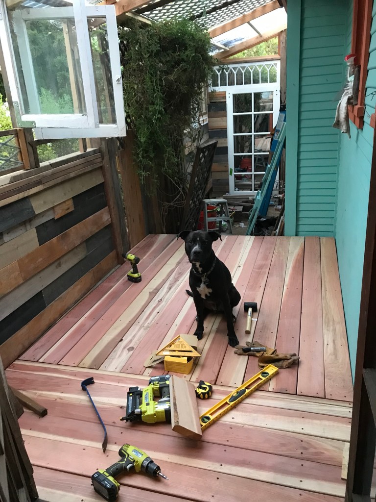 Lesson #3: About the redwood. I always feel terrible about using redwood, but we built this deck to last, and that’s what redwood does. We saved all the old boards from the old deck and they will be rehabbed into a raised garden path. I plan to use every scrap of the redwood somewhere. It is too precious a resource not to use it that way if you use it at all, and this deck is covered from the rain and built with approximately 9 million screws, so I figure that if our redwood house is still standing at almost 100 years old, so will this deck stand.