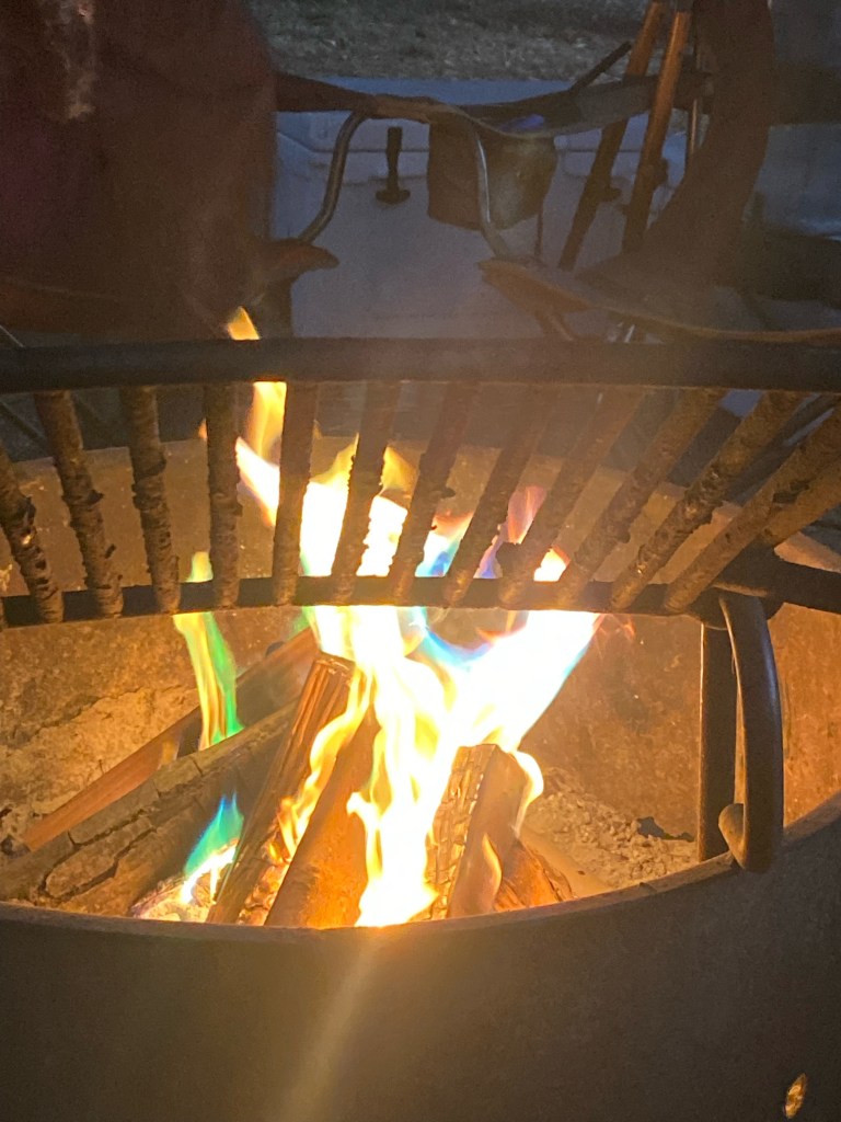 We had another dinner that couldn’t be beat, although I have no idea now what it was, and then we sat by the fire with the color changing packets to amuse us, talking of the things that fires inspire: old stories, new stories, and some laughter.
