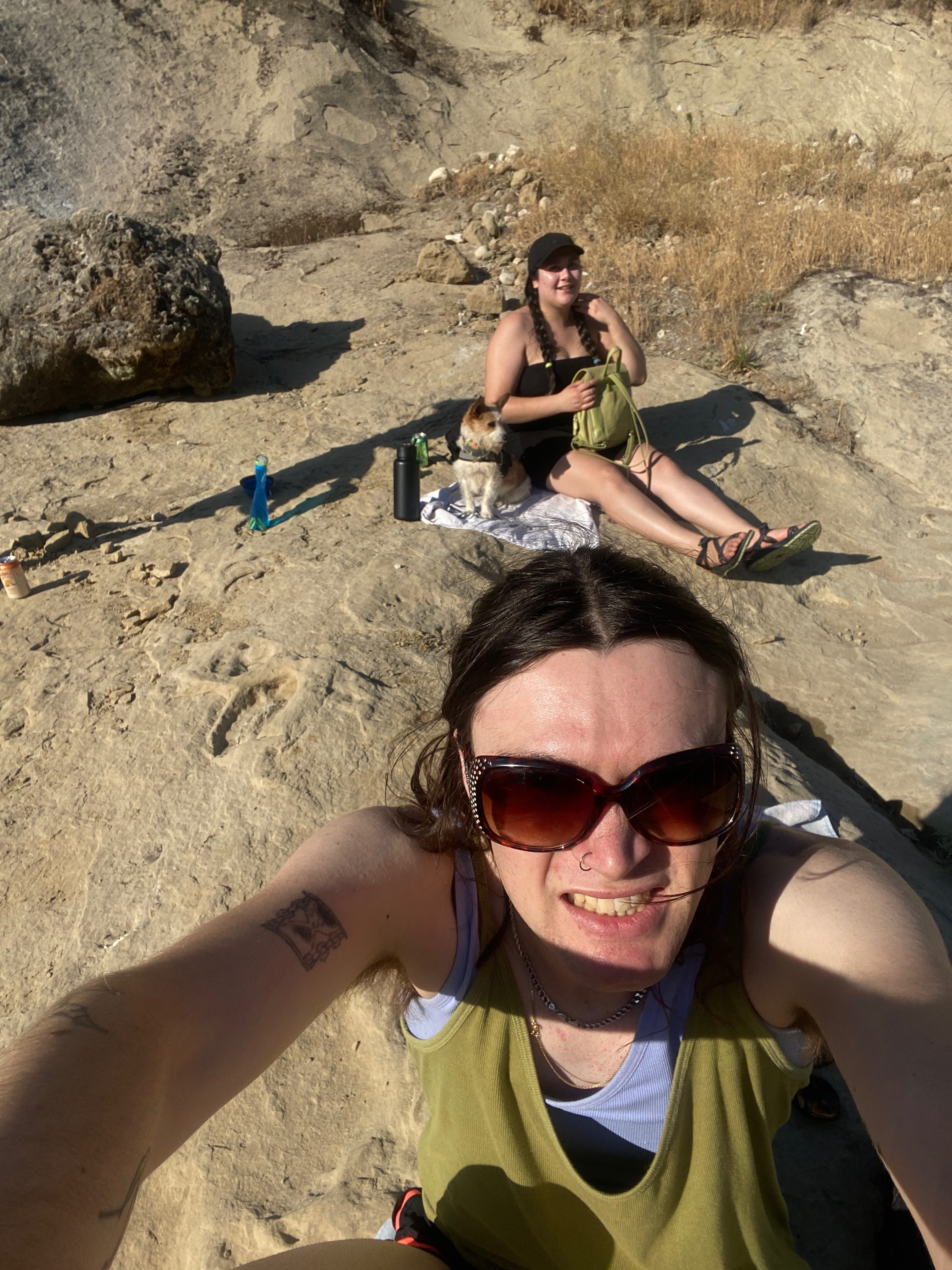 The campfire night was great, and then there was the morning, with some farm dog from across the road peeing everywhere and alerting Harold—Intruder! Intruder! —the dog even peed on the tent where Alicia and Ruby were sleeping—but then we all had breakfast and headed to town for errands. Robert wanted a hardware store for screws to repair the Bus interior and we needed food supplies, so it was pretty late when we got back to head out to the swimming pools. See, the thing is that Alicia and Ruby, (aka the kids) we have a connection to these pools. Way back when the kids were kids, we hiked back into them and had idyllic mermaid moments. Even later, we brought Robert and had rock breaking and mermaid and sea turtle moments. In later years, the road has been closed or we haven’t made it so far back with aging Chihuahuas and so forth, but we have collectively, remembered these swimming holes and the joy of water.