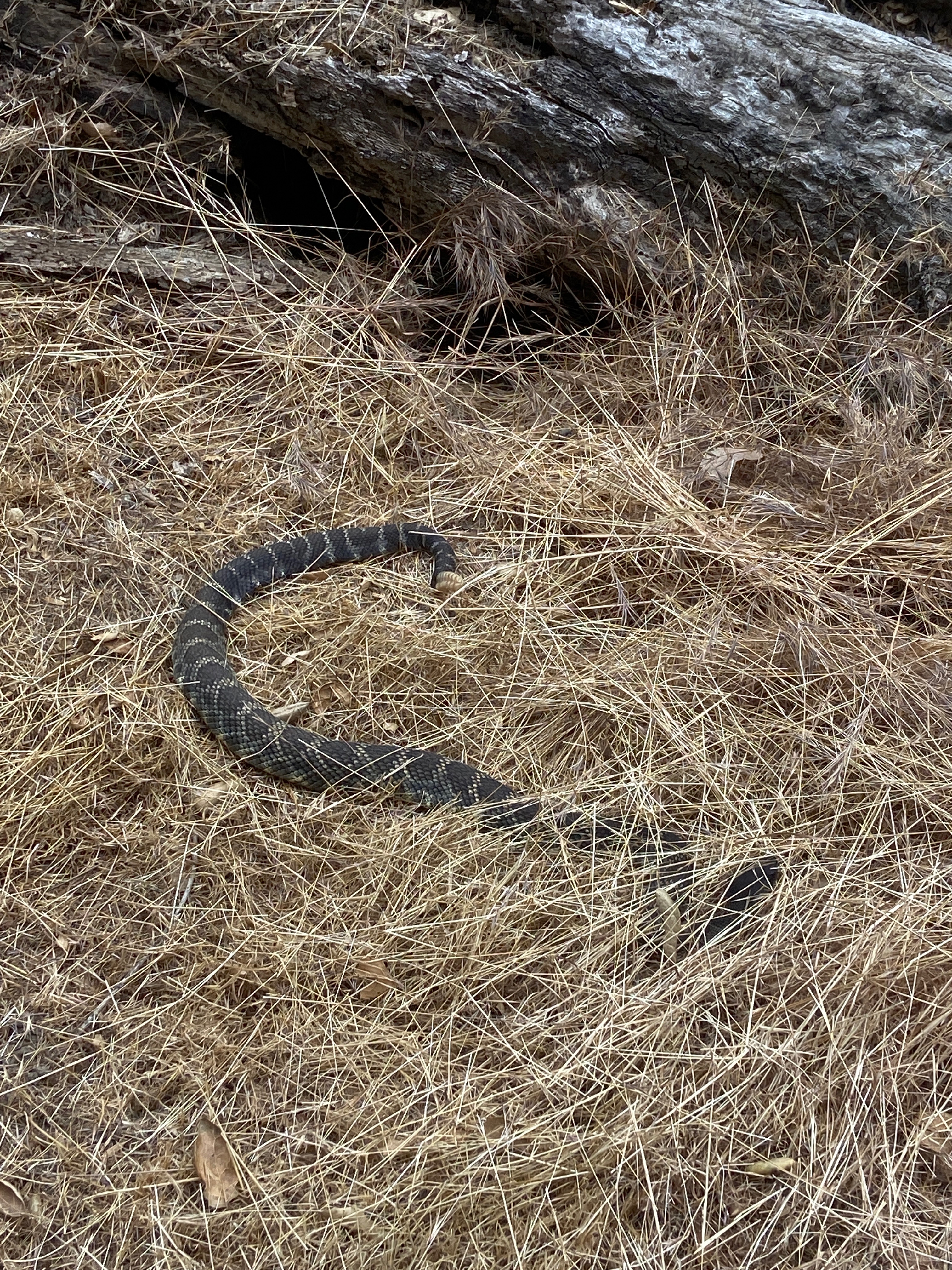 Puppers (Harold) had a good night’s sleep, and when I awoke, he was all nuzzles and puppy kisses, not the urgency of the day before. I woke later than usual to the call of the crows, and even Robert remarked on his sleep when he emerged from the Bus. “I think we should walk H around,” I said, for I know the dog likes to poop and pee first thing, and so it was peeing on the trees and rocks of the perimeter of our campsite, while Robert and I stood in the cloudy morning, not quite awake, thinking of more coffee and food. Harold took what I would call a prodigious dump and then started smelling a stick, only then in one of those moments that come in life, we realized the stick was not a stick because it had a head and rattles. It was a rattlesnake.