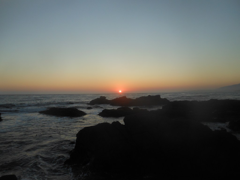 We stopped at my favorite liquor store on the coast, San Simeon Liquor, to throw money at them, and then back to the room, the bath, and dinner. I took my first and wondrous bath, and then we set out to eat dinner at a restaurant down the beach. We waited a long time for a table, and the food was like you might expect—(Tirian said while we were waiting g, “Do you think they will have “clam chowder in a bread bowl?”, and it was the first thing on the menu), but it was a lovely meal with the suddenly cleared sky (Thanks, Squishy) setting in glorious color behind us as we ate. And then we took the wooden path home into the sunset colors, like a calendar, and a bat swooped out and guided us home.