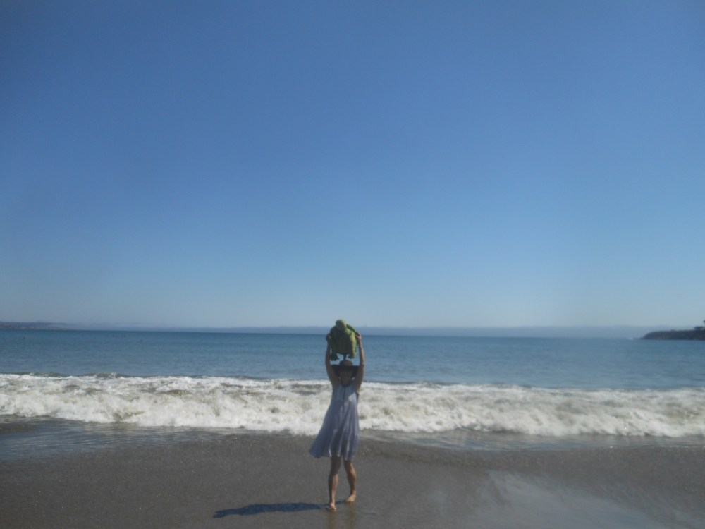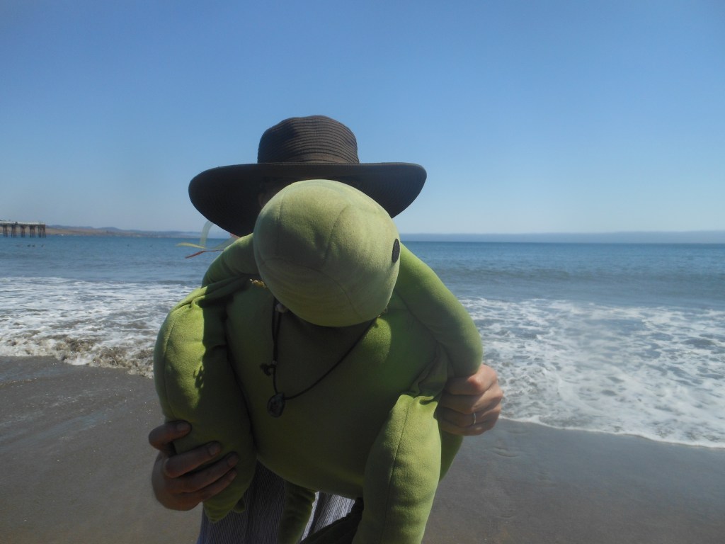 Tirian had visited this beach before with me, and so we headed out again, Squishy the sea turtle in my backpack, after stopping to get some excellent sandwiches at the French Corner Bakery in Cambria. We also got a great beach umbrella from the hardware store and mercantile in Cambria. And then we walked by the beach in the perfect temperature, hot feet cooled by the cool Pacific. And yes, we had a picnic and although our new beach umbrella earned the name “Houdini” for his escape movements in the wind, we were shaded and sated. And yes, Squishy the turtle removed his clothing to bask in the beach and bond with me, and yes, there were many, many pelicans, more than I have ever seen, but none followed us home (long story there).