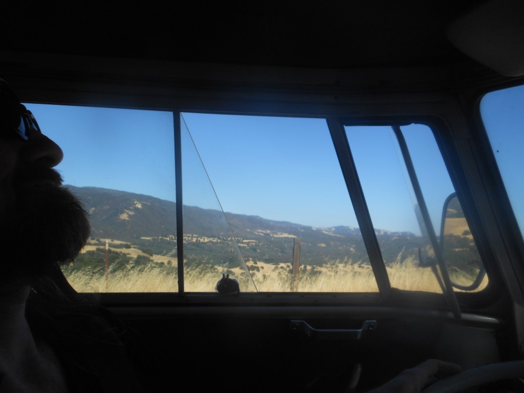 It was a twisty little gem of a road, through vineyards and cutting into canyons, crossing and old bridge, the folks frolicking in the river below also surprised to see the old Red Bus rolling by, lifting their hands to wave as we crossed the green and one lane bridge. The road was a beauty, narrow, meandering through oak groves, the golden, rolling hills of California offering sweeping vistas under blue skies. We talked and told stories of other roads, and climbed the ridges, our only company being hawks and turkey vultures.