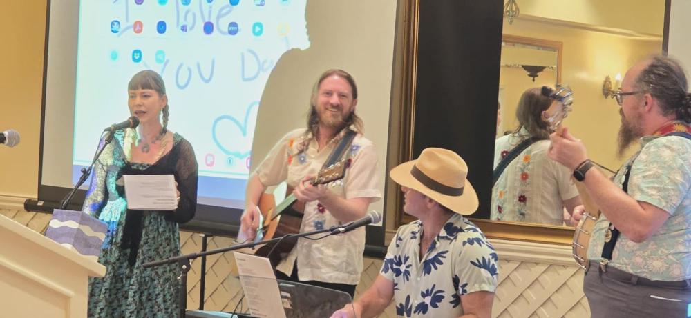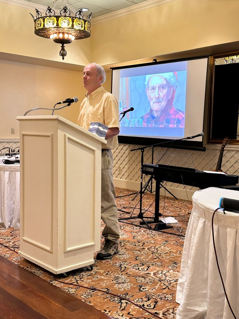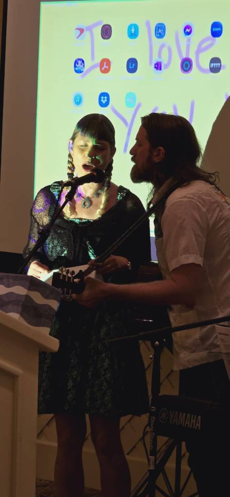 However, on that hot afternoon of August second, when I rolled up to the hotel on foot, my ballet flats slapping on the sidewalk, I was feeling panic: would the music be OK? Would we get the flowers there? And what of the setting up? The public speaking? Thankfully my amazing nephew Jordan stepped in to help me get the flowers, and then it was all a rush, setting up the tables with programs and bookmarks and the fans I had made from dad’s notes and Topomorpher prints, scattering the Puntini Italian candies dad had loved so (thanks to Bree for ordering them), and setting up the music, trying to have the first actual run through, and being so grateful for Bill’s daughter Ruby for her expertise with musical equipment. Just as we were trying to run through the songs one time all together now, Murray Huggins and his bagpipes arrived, and I realized that whatever the music was like, it was as good as it was going to get.