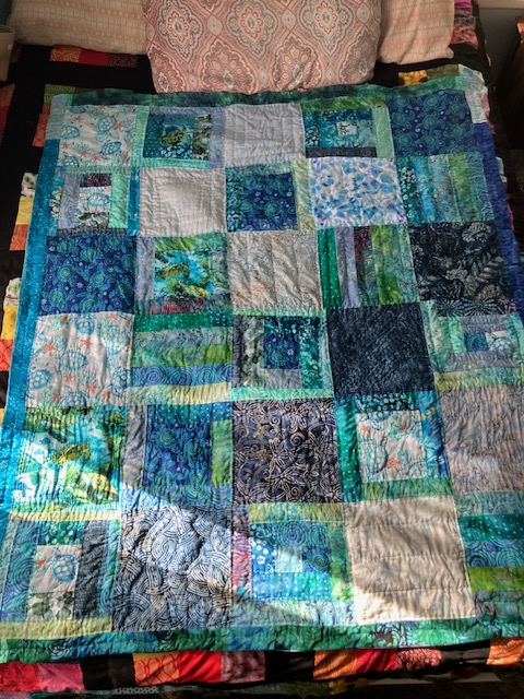 I want to make it clear here that I didn’t know what I was doing exactly. I made squares of squares, some log cabin squares with sea turtles in the middle and cut some big squares. Eventually, I laid it all out on the bed, and still feeling my way through the process, I stitched it all together. “This is a learning quilt,” I told myself, and gave myself the freedom to learn and make mistakes, of which I made many. Even today that quilt has at least two upside down sea turtles—and who can tell? except that the coral in the background is facing the wrong way. I also kept telling myself that handmade things may have flaws, and this is a good thing because it shows that they are handmade.