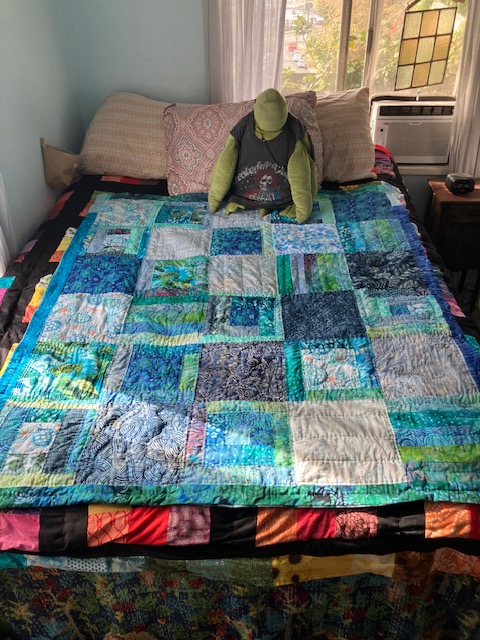 So, a sea turtle quilt. Well, certainly I had sea turtle fabric, and lots of fabric strips in ocean colors, but time, well, there was no time. I was teaching 5 classes, and then I found out I had cancer. Oddly, this was what moved me to piece and sew the quilt. I started cutting pieces on December 16th, and by December 20th, I had the whole thing laid out and sewn together. I had the backing of the terrapin Grateful Dead fabric ready to go.